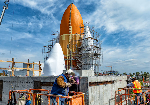 The shuttle was then lifted over 10 feet using the Enerpac system to facilitate the placement of specialized transportation frames before embarking on its final journey to the Samuel Oschin Air and Space Center building, where it was lifted, upended and set into place using the Liebherr 1750 crawler crane.