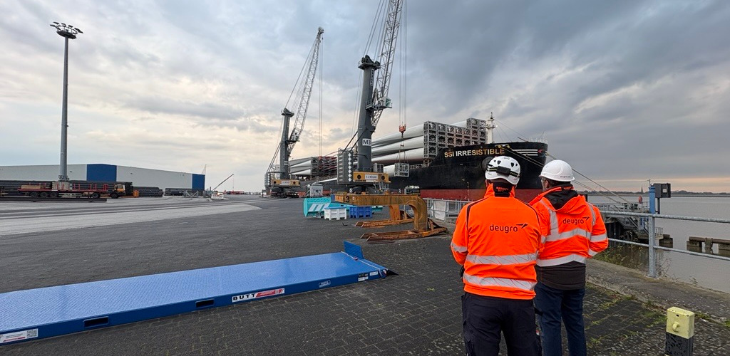Top photo: deugro oversees the loading of wind turbine blades at the Port of Brake, Germany. Credit deugro